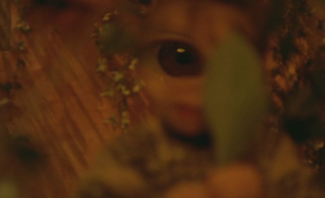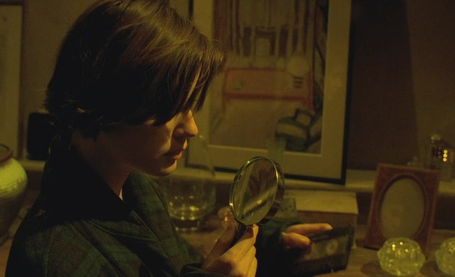 [B:16:57; 1:05:44]维罗妮卡拿放大镜看磁带,放大镜反射出她自己的形象。