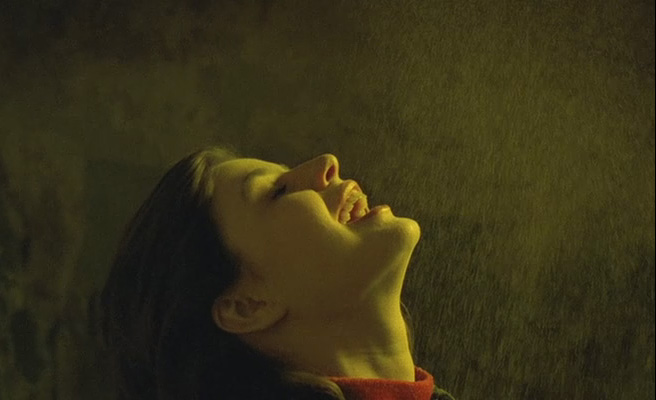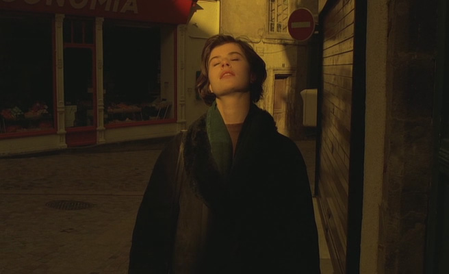 [A:13:25-13:49; 13:09-13:32]波兰维罗妮卡去试声路上的段落,与[A:47:29-47:44; 47:23-47:37]法国维罗妮卡走出公寓的段落,最后定格的陶醉表情是一样的,前者走向音乐,后者走向爱情。这个表情的来源是影片开始时波兰维罗妮卡雨中的歌唱。