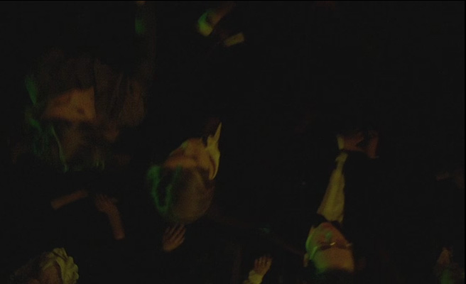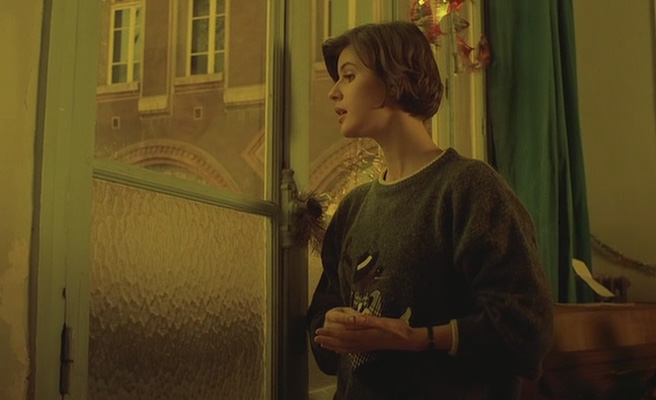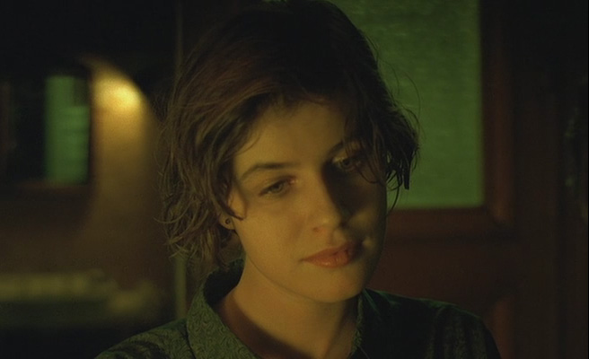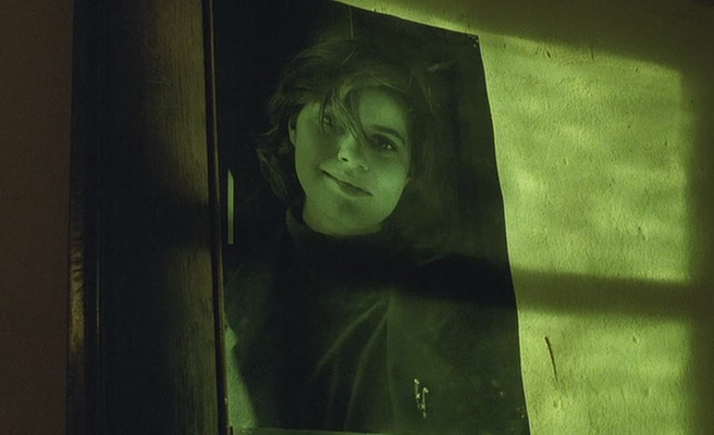 [A:07:21; 7:04]波兰维罗妮卡从梦中惊醒,找父亲说话,幽暗的黄绿色灯光与片尾[B:40:28; 1:29:35]法国维罗妮卡穿过走廊找亚历山大的灯光是一致的。