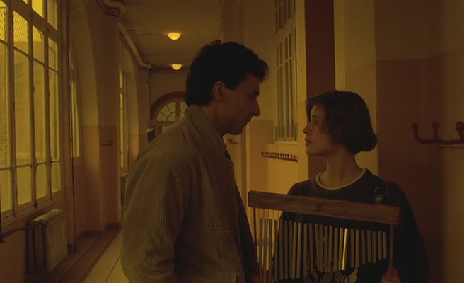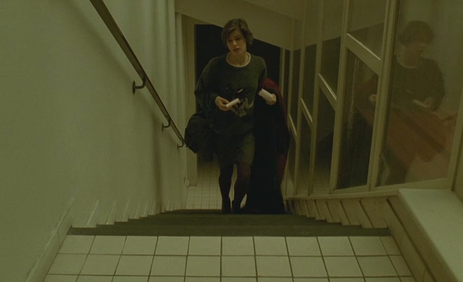 法国维罗妮卡的故事,镜像的运用则略有不同。[A:39:57; 39:40]维罗妮卡从窗口张望亚历山大,给了一个隐约的镜像,背景声音是学生排练协奏曲。[A:40:44; 40:38]从心脏科出来的楼梯上给了镜像,暗示两人心脏病的联系。