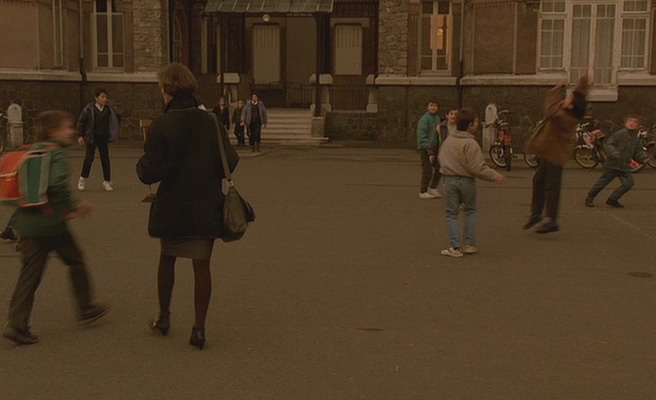 辞职以后改去小学任教,这个职业身份改变的交代,是[A:34:42; 34:26]她走进学校,迎面一个孩子打招呼Bonjour Mademoiselle。