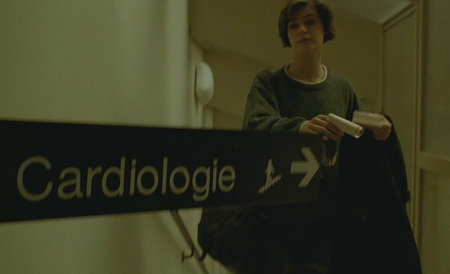 第一次交代法国的维罗妮卡也有心脏病,是[A:40:34; 40:18]在操场旁倚在树上。同样挨着林荫道,不同的是这里只是一个小孩做守门员,不是波兰维罗妮卡看到的那个穿风衣的陌生男子。[A:40:47; 40:41]上楼梯的牌子上写着Cardiologie(心脏科),这个牌子歪了,维罗妮卡把它扶正,指向楼下,表明诊断已经结束。