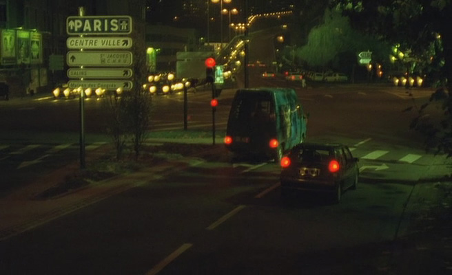 [A:41:04; 40:59],维罗妮卡和亚历山大路口邂逅,先给了一个路牌,巴黎是正前方,稍后亚历山大向前开,维罗妮卡向右走,交代了亚历山大住在巴黎,维罗妮卡的公寓在另一条路上。