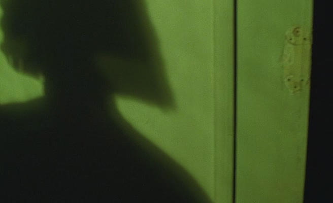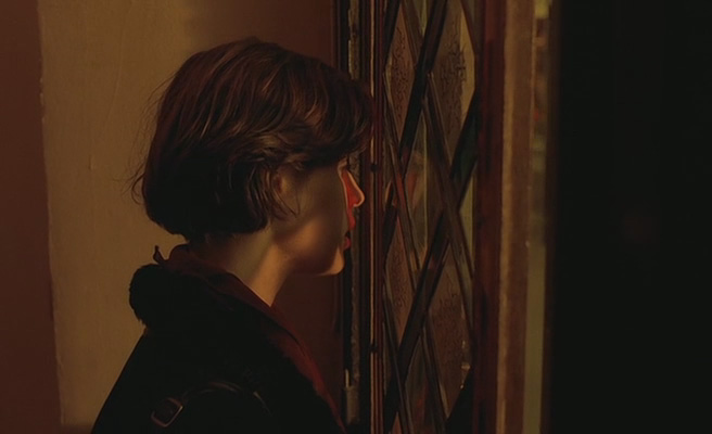 [B:25:55; 1:14:55]维罗妮卡在一扇门里躲避亚历山大,在她观察亚历山大的视线上给了门玻璃中的镜像。