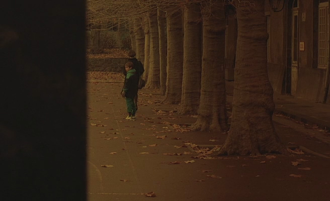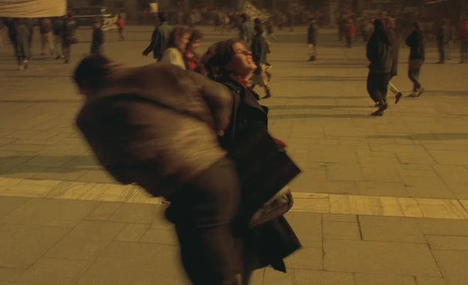 波兰维罗妮卡出场的时候,还沉浸在自己的音乐世界里,仿佛跟外面热闹的政治事件分处两个空间,然后她开始很得意地转小圈——转大圈——转到外面的路上,阳光从正面照在她的脸上,延续了上一个陶醉镜头的情绪。背景的人群最初是缓慢向右,节奏配合维罗妮卡的情绪;之后由于警察的出现(此时还没有出现在镜头里),开始有人向左奔跑,加速,直到出来一个人把维罗妮卡撞翻——把她强行撞进外面的空间。在这个分界点上,剪掉了一段拾谱子的动作,一方面是事件已经交代清楚,留多了会拖节奏;另一方面则是为了强调分界点本身——请注意此前广场上阳光普照,此后则是阴天——暗示了剪掉部分的心理时间跨度。