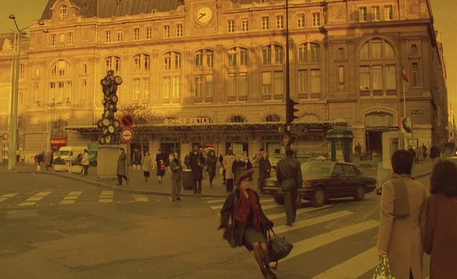 波兰维罗妮卡注视法国维罗妮卡时,第一个表情是惊讶,镜头给的是45度侧面,背景是密集的跑动人群;扫视了法国维罗妮卡上车的整个过程以后,第二个表情是欣慰,嘴角稍微抽一下,镜头给的是正面,背景是稀疏的跑动人群。此时因为是阴天的散射光,面部的柔和光线恰与情境相配合。