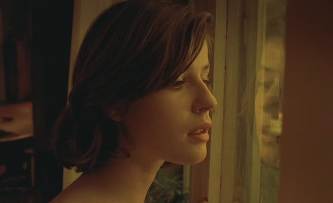 [A:08:17; 8:00]维罗妮卡从梦中醒来,跟父亲说感到自己并不孤独,镜头给了她在幽暗灯光下的镜像。