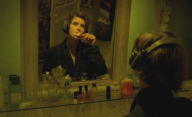 [B:14:22; 1:03:10]维罗妮卡一边对镜刷牙一边听亚历山大寄来的磁带,刚好此时录音里传出了另一个维罗妮卡的歌声。
